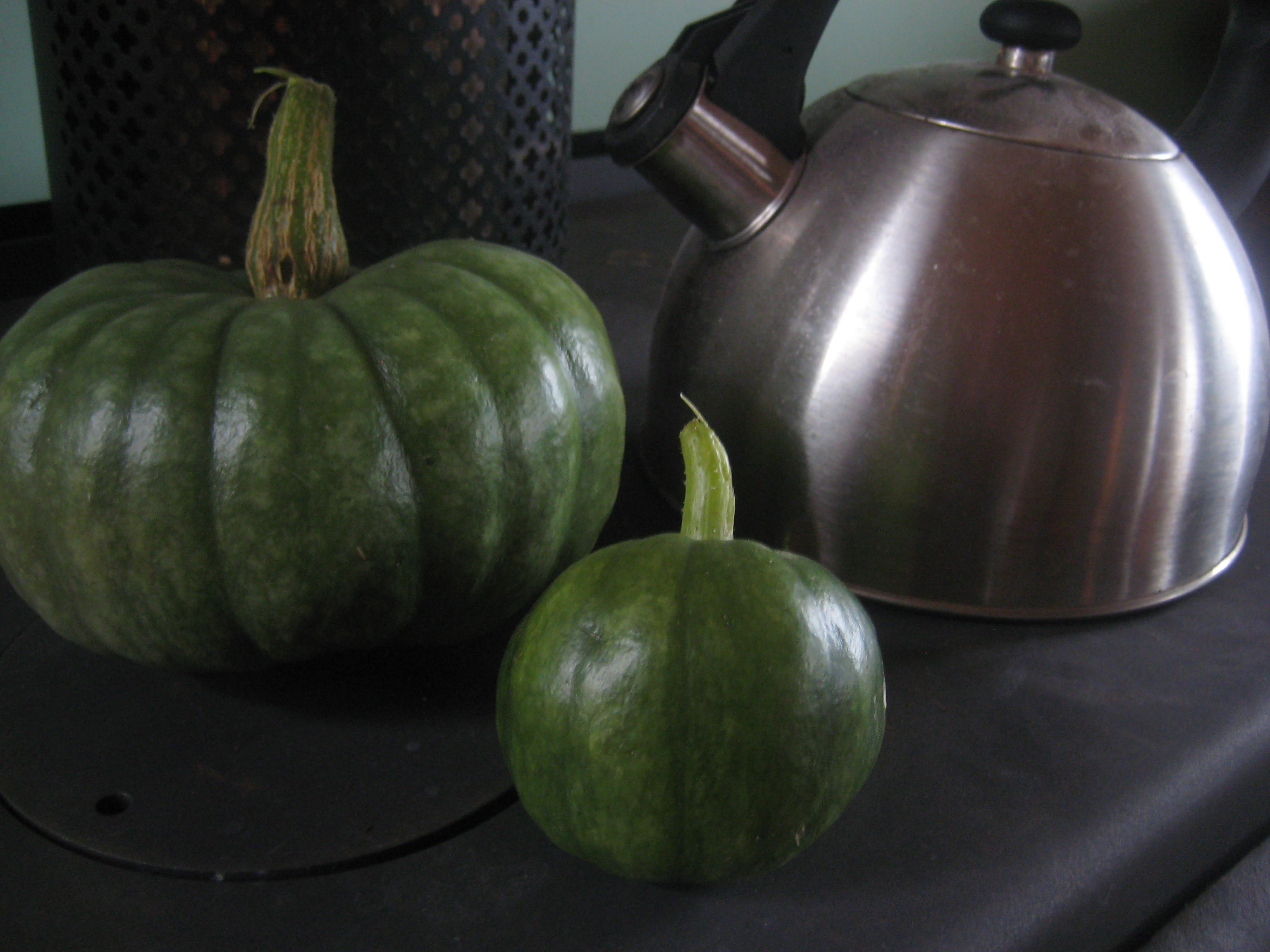 This is my third attempt at growing pumpkins… I have never had much success before, and although I still would not count this one as a great success either I am proud to actually have a pumpkin shaped pumpkin. We ate the small one (it’s about about palm sized) and about a quarter of the larger one last night, and there should be enough for at least one more meal of pumpkin from the rest… so, a small success – and I’ll just keep on trying again. 🙂