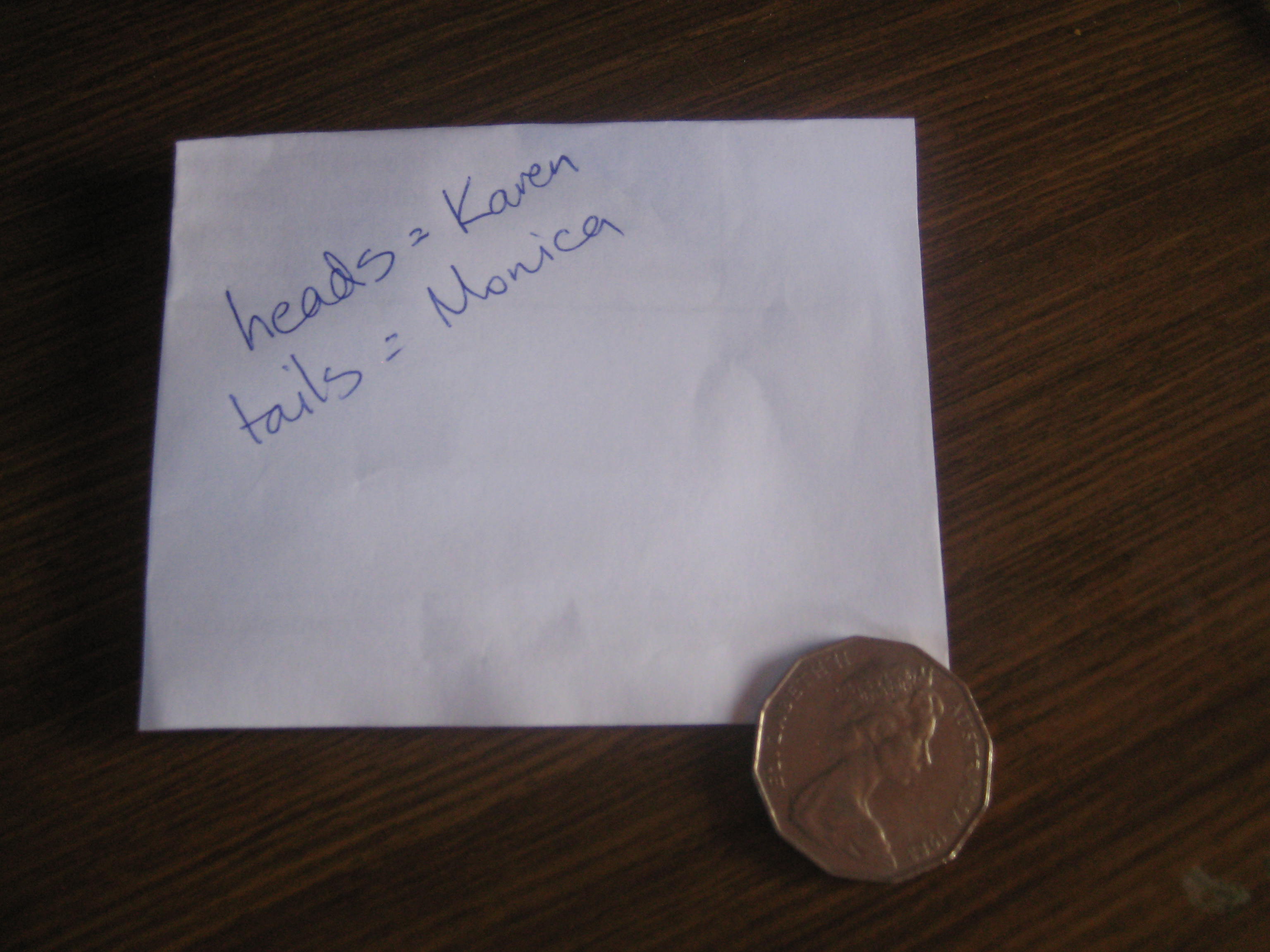 Heads Karen, and tails Monica… and Karen it is! Congratulations. I’ll be in touch shortly so you can be reading your book in no time!!