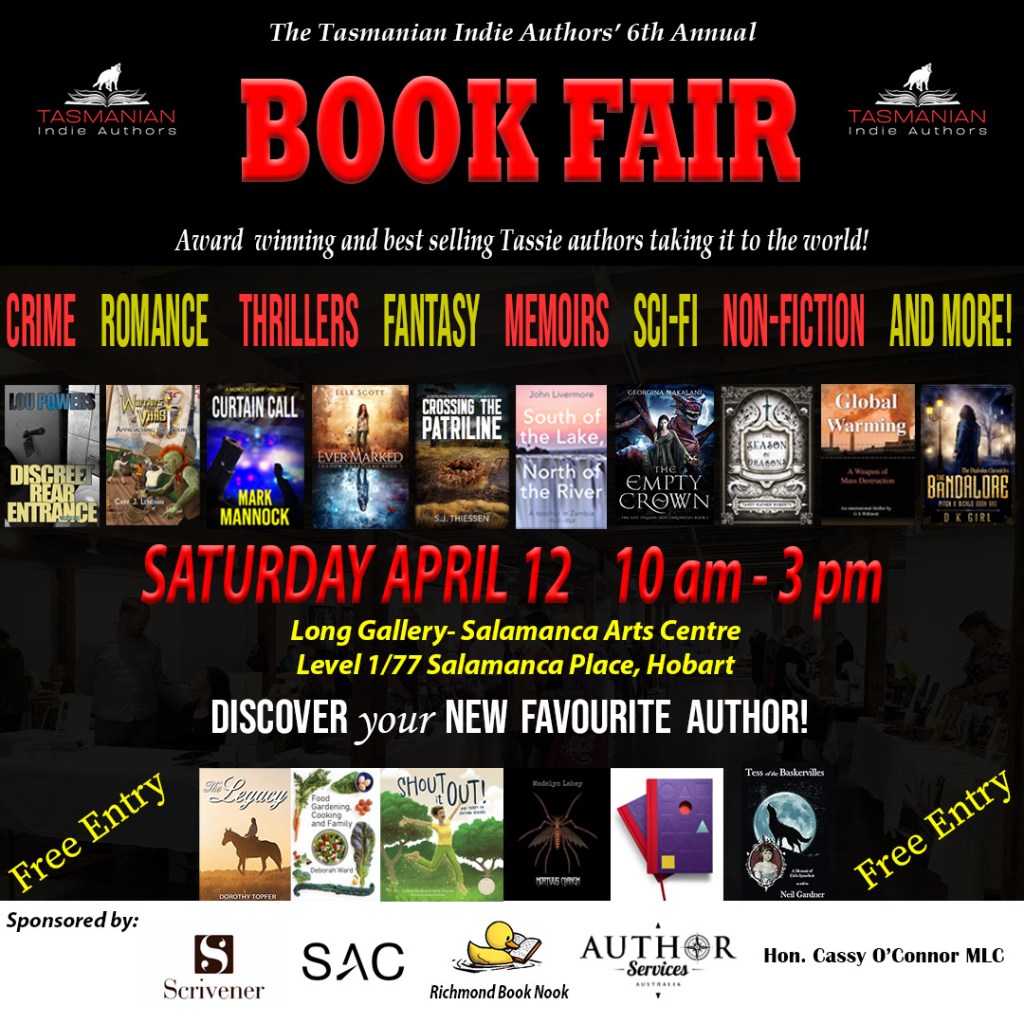 Then in April it’s time for the Tasmanian Indie Author’s 6th Annual Book Fair!! I’ll be there along with a bunch of other Tasmanian Authors so if you’ll be in Hobart on Saturday 12 April come along to the Salamanca Arts Centre and say hello!